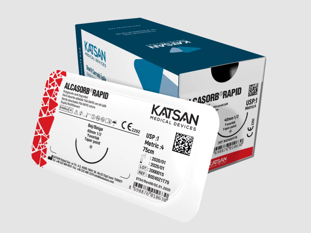 ALCASORB® RAPID sütürleri, steril, örgülü, bej renkli, USP 6/0 – USP 2 (metrik 0,7-5) aralığında, 10 cm’ den 150 cm’ e kadar çeşitli uzunluklarda, paslanmaz çelik iğneli veya iğnesiz olarak üretilirler.